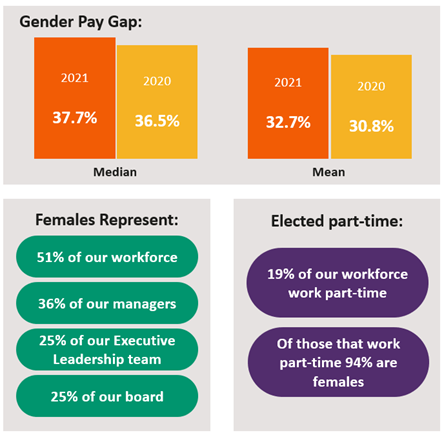 We saw a slight increase of 1.2% for the median gender pay gap at 37.7% as at a snapshot of data on April 5 2021, but remain at an improved rate of 4.2% from 2019. The median gender pay gap means that females earn an average of 37.7% less per hour (excluding overtime) than men, or in other words the average female employee would earn 62.3p for every £1 earned by a male employee.